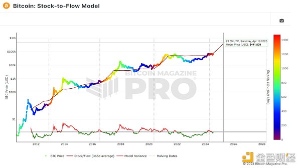 顯而易見,Bitcoin在2024年減半后的價格趨勢與前幾個周期相似。下圖所示的模型表明,供應量的減少可能會在減半后的一年內將價格推高至約44萬美元(紅線)。如此高的峰值將打破下圖中的趨勢,即自S 2 F「公平估值」之上的偏差持續下降,同時也可見下方振蕩器中的峰值波動性降低。