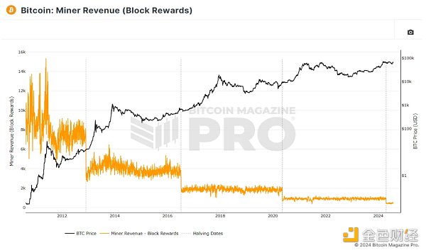 隨著礦工從交易手續費中獲得的收入增加,減半事件在塑造礦工激勵機制中的重要性可能會降低。如果交易手續費占礦工收入的比重越來越大(如下圖中黃色陰影區域所示),礦工可能會對區塊獎勵減少50%的影響不那么擔憂(區塊獎勵收入在下圖中以藍色陰影區域表示)。這一轉變表明,減半事件對礦工行為以及Bitcoin價格的主導影響可能會隨著時間的推移而減弱。