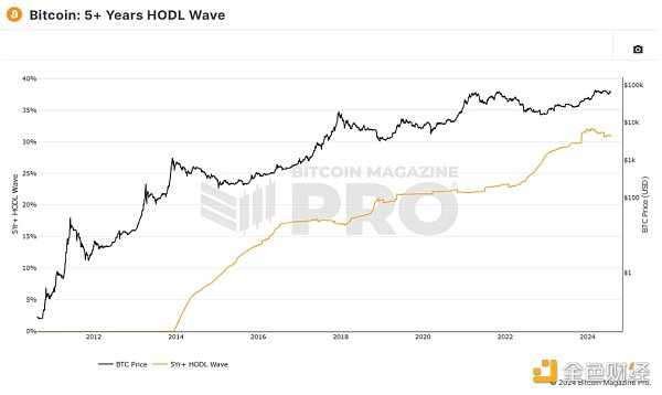 長期持有Bitcoin的趨勢日益增加,這是可能減弱Bitcoin價格周期性波動的另一個因素。數據顯示,超過30%的供應量在過去5年內沒有移動過,這一比例在宏觀層面上可能會繼續迅速上升,如下圖所示;橙色線表示至少半個世紀沒有變動的Bitcoin的百分比。無論這些Bitcoin是丟失的還是被長期投資者持有,這種行為減少了流通供應量,現已超過減半事件帶來的新供應減少的影響。