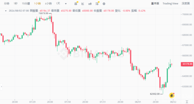 美股劇烈波動,Bitcoin回升至65K