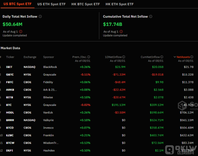 除了灰度迷你基金B(yǎng)TC以1.91億美元的凈流入領(lǐng)跑市場,貝萊德的IBIT也錄得2590萬美元的凈流入。其他基金的表現(xiàn)則不太理想?;叶菺BTC凈流出7133萬美元,富達FBTC凈流出4840萬美元,Ark Invest和21Shares的ARKB凈流出2242萬美元。