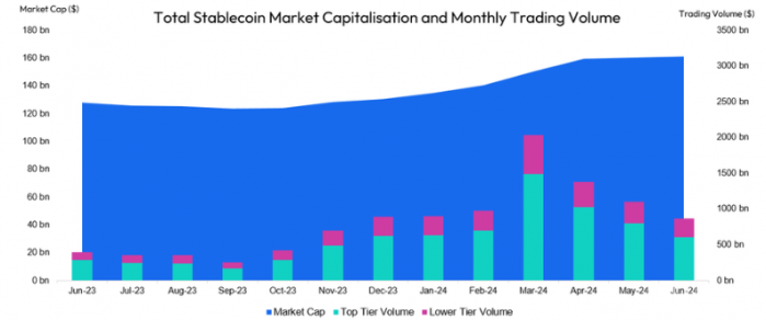 根據(jù)Coingecko的數(shù)據(jù),Tether的USDT和Circle的USDC在1640億美元的穩(wěn)定幣市場中占據(jù)主導(dǎo)地位,約占90%的市場份額。這顯示了穩(wěn)定幣在全球范圍內(nèi)的重要性和廣泛應(yīng)用。
