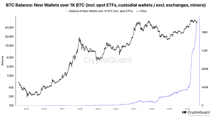 CryptoQuant首席執(zhí)行官Ki Young Ju指出,擁有至少1000 BTC的Bitcoin地址每周平均增加超過(guò)100,000 BTC。他提到:“鯨魚錢包(>1K BTC),包括現(xiàn)貨 ETF 和托管錢包,今年新增145萬(wàn)BTC,總計(jì)180萬(wàn)BTC。2021年,全年轉(zhuǎn)移約7萬(wàn)枚BTC;現(xiàn)在,這個(gè)數(shù)字是每周10萬(wàn)Bitcoin。我重復(fù)一遍,每周10萬(wàn)Bitcoin。”