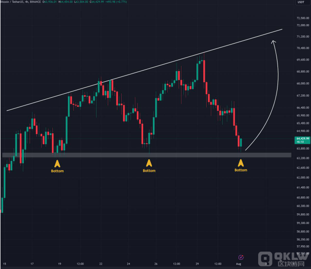 crypto分析師Elja在8月1日于X平臺(tái)上表示,Bitcoin價(jià)格可能在63,000美元上方形成新的局部底部,該水平此前是BTC在四小時(shí)圖表上的強(qiáng)勁支撐:“BTC已經(jīng)觸底?,F(xiàn)在是綠色大蠟燭出現(xiàn)的時(shí)候了?!?/p>