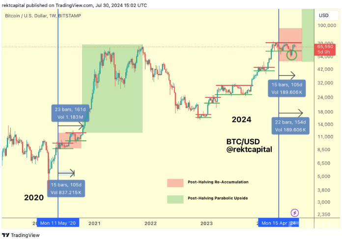 Bitcoin在70,000美元的心理阻力位遭到拒絕,著名分析師Rekt Capital認(rèn)為,Bitcoin可能會(huì)在該區(qū)間保持一段時(shí)間。他在7月30日的X平臺(tái)上寫道:“Bitcoin仍有望突破。歷史表明,減半后約100天突破重新積累區(qū)間總是不太可能的。”