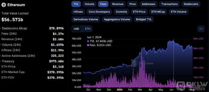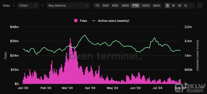 鏈上數(shù)據(jù)顯示,2024年第一季度,Ethereum日均產(chǎn)生的費(fèi)用超過(guò)1000萬(wàn)美元;2024年3月,這一數(shù)字達(dá)到了1500萬(wàn)美元。到第二季度,平均每日費(fèi)用降至約350萬(wàn)美元,7月份的平均總收入略低于300萬(wàn)美元。