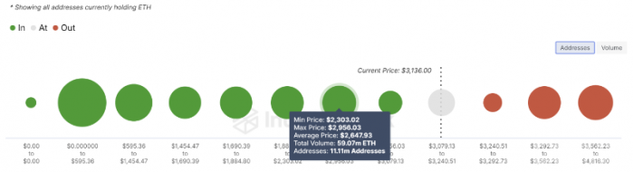 根據(jù)IntoTheBlock的數(shù)據(jù),大約369萬(wàn)個(gè)地址在3000美元的價(jià)格點(diǎn)持有124萬(wàn)枚ETH,這一價(jià)位是ETH的直接心理支撐。與2700美元的關(guān)鍵支撐位相比,這一支撐相對(duì)較弱。在2700美元范圍內(nèi),1111萬(wàn)個(gè)地址持有高達(dá)5907萬(wàn)枚ETH,平均價(jià)格為2647美元。