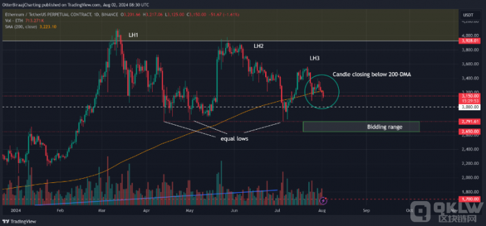 ETH價(jià)格面臨跌破3000美元的風(fēng)險(xiǎn)