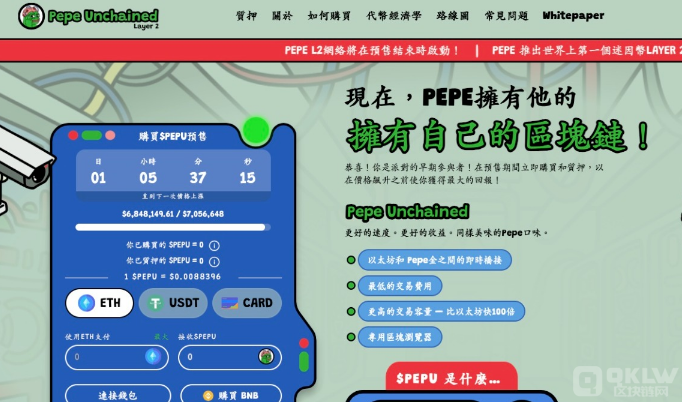 Pepe Unchained($PEPU)是一個嶄新的meme幣,其獨特之處在于它建立在Ethereum的Layer 2鏈上,提供了更快且成本更低的交易方式。這使得$PEPU具備了相較于其他meme幣更高的競爭優(yōu)勢。