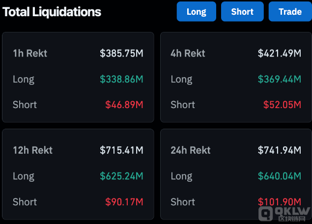crypto市場的急劇下跌導致多頭頭寸被廣泛清算。數據顯示,過去24小時內共清算了7.4194億美元的頭寸,其中多頭頭寸占6.4億美元,影響了197,767名交易者。