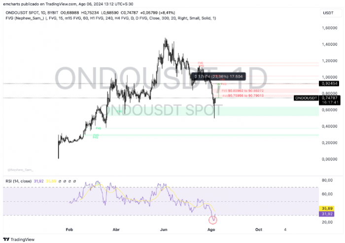 動量相對強度指數(shù)(RSI)顯示,ONDO Tokens已從“超賣”區(qū)域反彈,當(dāng)前讀數(shù)為 31.92,這暗示存在買入信號。從技術(shù)分析角度來看,ONDO 可能在 0.5289 美元至 0.6422 美元之間找到支撐。如果每日蠟燭收盤價低于 0.74 美元,則看漲論點可能會失效。