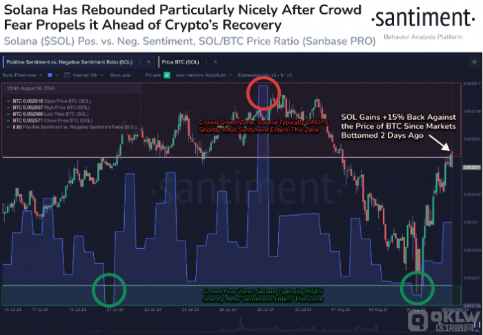 最近幾天,Solana的表現顯著優于其他主要crypto。自8月5日觸底以來,SOL價格相對Bitcoin(BTC)上漲了超過15%。分析師Santiment在社交媒體上評論道:“從市場情緒來看,Solana 是一款表現突出的crypto。如果市場對其持有更多信心,SOL 可能會繼續上漲?!?/p>