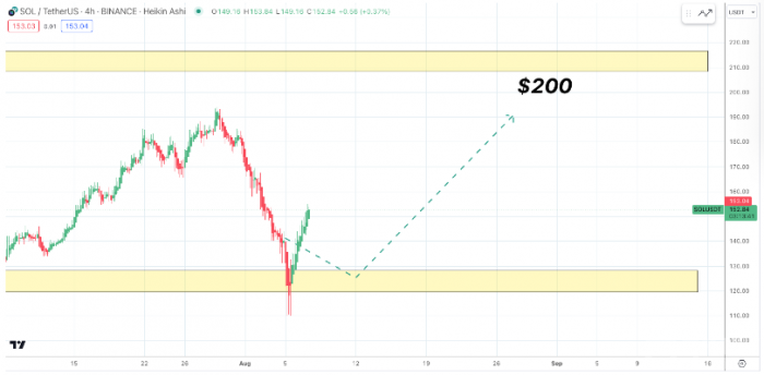 盡管如此,著名分析師Hov在8月6日的分析中警告稱,Solana 必須將148美元轉變為支撐位,否則可能面臨回調至100美元以下的風險。他表示:“SOL 正處于關鍵的技術水平。如果我們能夠維持高位時間框架(HTF)在148美元以上,價格可能會繼續上升至180美元左右。”