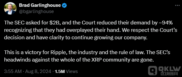 Ripple 的首席法務官 Stuart Alderoty 對裁決表示尊重,并承諾公司將履行罰款要求。他在社交媒體上表示:“我們尊重法院的裁決,并將繼續致力于公司的發展。SEC 對 XRP 社區的障礙已經被清除。”