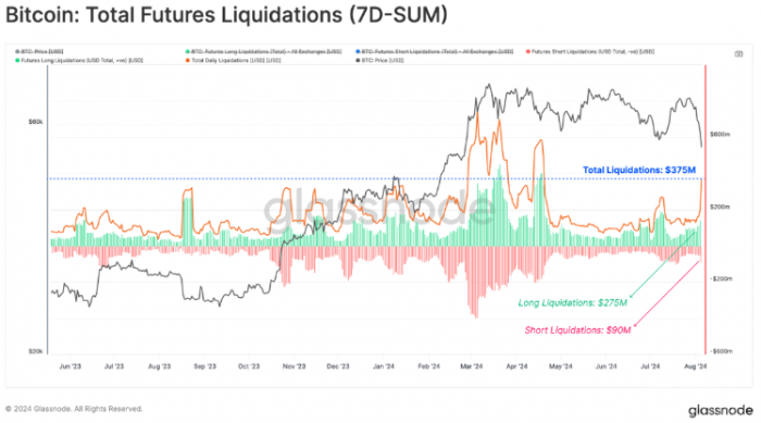 Glassnode稱,8月是一個“充滿活動的特殊月份”。在這一時期,Bitcoin錄得了自歷史最高點以來的最大跌幅(-32%),這導致短期持有者的顯著投降。期貨市場的清算進一步加劇了這一情況,超過3.65億美元的合約被迫平倉,未平倉合約下降了3個標準差,大量杠桿被迅速清除。