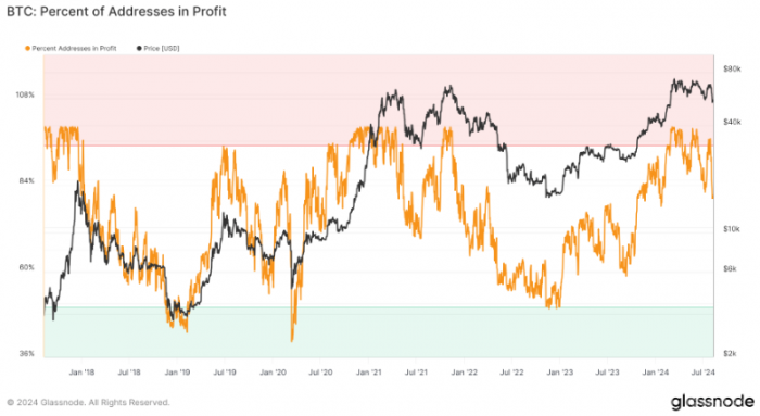 到8月份,Bitcoin盈利地址的比例已降至約80%。這一趨勢(shì)反映了Bitcoin市場(chǎng)的周期性特征,類似于2018年至2023年期間觀察到的模式:初期急劇上升后隨之急劇下跌。