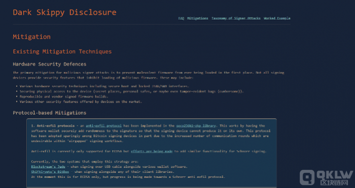 “Dark Skippy”是一種新型的攻擊技術,研究人員在8月5日發布的報告中詳細介紹了該方法。根據報告,這種攻擊能夠利用硬件錢包生成的低熵隨機數,從而在僅進行兩筆簽名交易的情況下,推斷出Bitcoin硬件錢包的私鑰。該方法的最新版本相比于早期版本有顯著改進,甚至可以在用戶只發布少量交易的情況下成功實施攻擊。