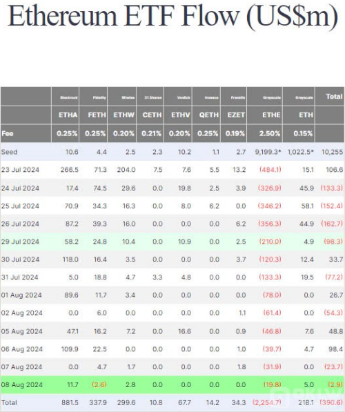 與BitcoinETF相對的是,EthereumETF的資金流出情況。盡管貝萊德的ETHA基金流入1170萬美元,Grayscale的ETHE基金資金流出量減少了1980萬美元,但總體上,EthereumETF的資金流出量仍然達到290萬美元,Farside的數據表明,目前EthereumETF的總資金流出量為3.906億美元。
