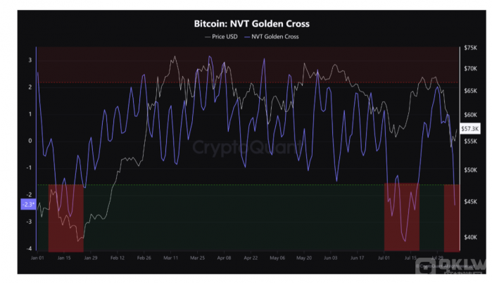 另外,根據(jù)鏈上分析平臺(tái)CryptoQuant 8月8日的最新研究,Bitcoin在2024年已經(jīng)第三次發(fā)出“局部底部”信號(hào),市場(chǎng)可能即將迎來(lái)反彈。該研究指出,網(wǎng)絡(luò)價(jià)值與交易量黃金交叉(NVT-GC)指標(biāo)顯示出看漲趨勢(shì),暗示Bitcoin價(jià)格有望回升。