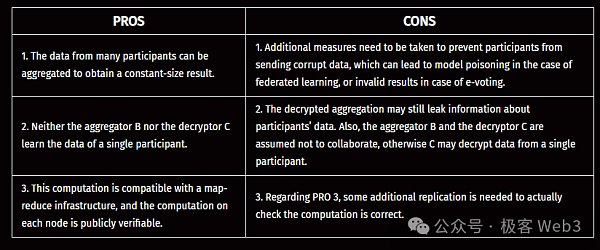 在這種情況下,使用FHE是可行的,所有參與者都有動機誠實地遵循協議規定。而在參與方并非彼此合作的場景中,確保計算任務已被正確執行的最簡單方法,是引入冗余(類似于多簽/共識)。例如,在前面提到的外包和聚合場景中,同態計算用到的函數公式是完全公開的,并且可以是確定性的,只要兩個或更多獨立實體得出完全相同的輸出密文,那么整個計算過程就是正確的,結果也是可信的。冗余程度越高,最終結果的可信度就越高,但這需要在效率方面進行權衡。