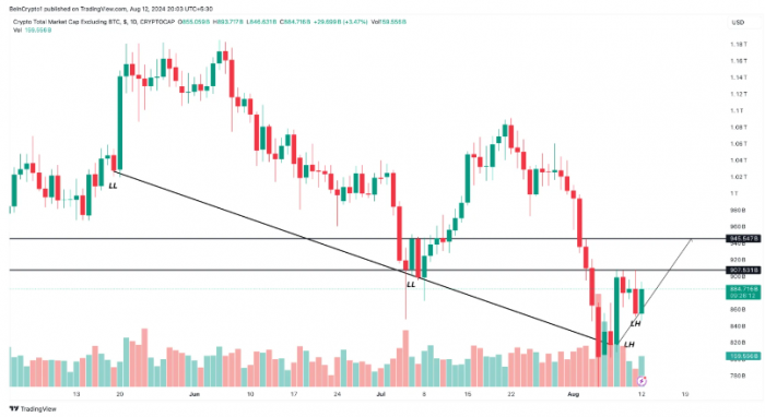 同時,TOTAL2的日線圖顯示出試圖突破下降結(jié)構(gòu)的跡象。從5月到8月初,山寨幣總市值形成了一系列較低的低點,但目前已出現(xiàn)較低的高點,這可能預(yù)示著強勁上升趨勢的形成。