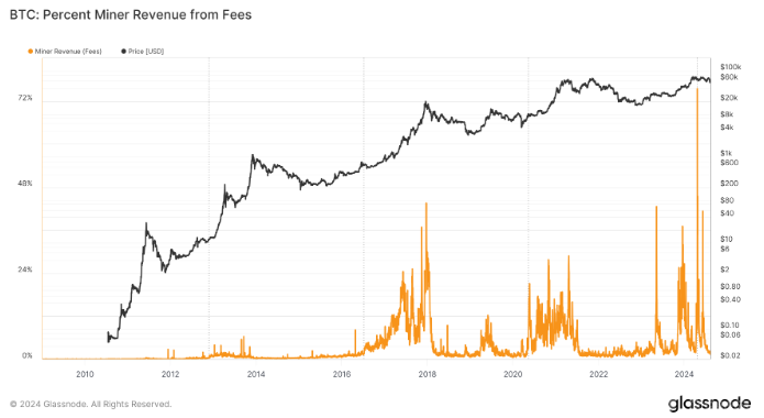 隨著Bitcoin區(qū)塊獎勵減半,礦工在需求高漲時期對交易費(fèi)用的依賴性也在加大。過去的模式表明,礦工在面臨補(bǔ)貼減少時,會更加依賴于交易費(fèi)用來維持其運(yùn)營,這使得交易費(fèi)用的波動對礦工的經(jīng)濟(jì)狀況影響深遠(yuǎn)。