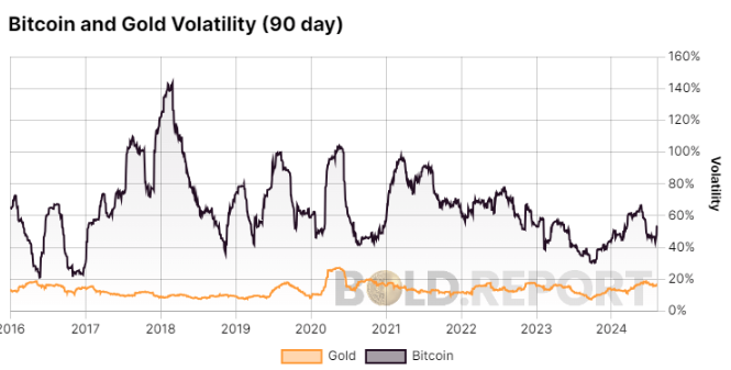 根據(jù)Bold Report的數(shù)據(jù),Bitcoin的波動性雖然仍高于黃金,但其相對波動性也在逐步降低。黃金的波動率通常保持在20%以下,而Bitcoin的波動性則在不斷發(fā)展中趨于穩(wěn)定。