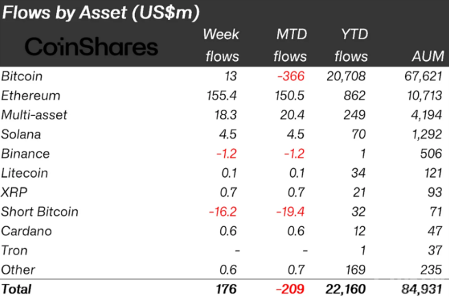 報(bào)告指出,截至8月11日的一周內(nèi),數(shù)字資產(chǎn)投資產(chǎn)品的總流入達(dá)到了1.76億美元,其中EthereumETP占據(jù)了1.55億美元,約占總流入的88%。相比之下,BitcoinETP本周僅錄得1300萬(wàn)美元的流入。