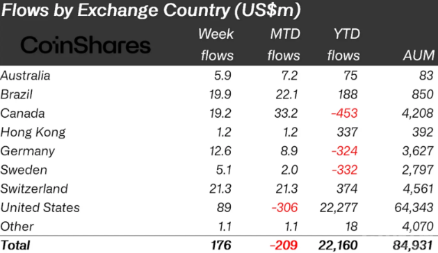 CoinShares還指出,上周的市場(chǎng)暴跌與以往不同,各地區(qū)均出現(xiàn)資金流入,顯示出投資者對(duì)加密資產(chǎn)的樂(lè)觀態(tài)度。美國(guó)、瑞士、巴西和加拿大等地的資金流入最為顯著,流入金額在2000萬(wàn)至8900萬(wàn)美元之間。