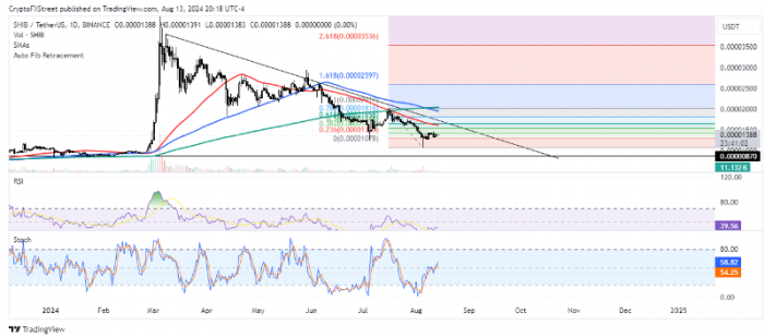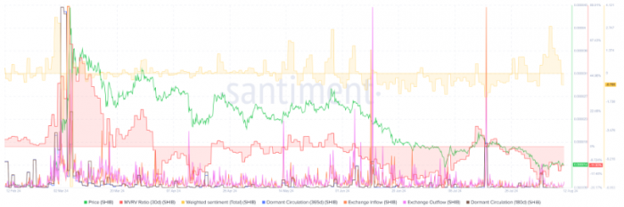 盡管近期市場(chǎng)出現(xiàn)波動(dòng),8月5日的市場(chǎng)崩盤對(duì)SHIB投資者的影響相對(duì)有限。在此期間,凈流入和流通中的不活躍Tokens并未顯示出典型的交易峰值。此外,SHIB的加權(quán)情緒已降至-0.7,顯示出投資者情緒較為低迷,30天市值與當(dāng)前價(jià)值(MVRV)比率為-11.9%,表明大多數(shù)投資者平均損失約11%。
