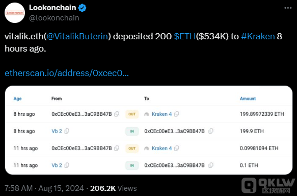 Lookonchain數(shù)據(jù)顯示,Ethereum創(chuàng)始人Vitalik Buterin向Kraken交易所轉(zhuǎn)入了價(jià)值534,000美元的ETH,這一舉動(dòng)可能增加市場的拋售壓力。