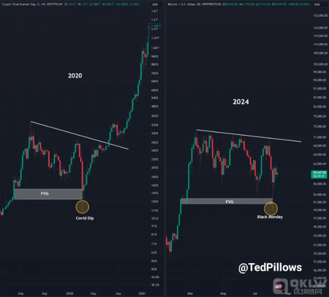 投資者Ted Pillows在社交媒體上分享了他的看法,認為Bitcoin的公允價值缺口(FVG)已被填補。他提到,這一現(xiàn)象在2020年COVID-19崩盤期間也曾出現(xiàn),隨后引發(fā)了強勁反彈。基于歷史經(jīng)驗,Ted預(yù)測Bitcoin到9月底可能會再次突破70,000美元。