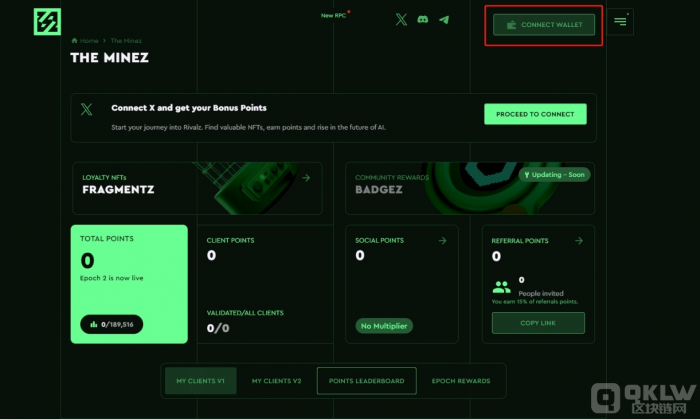 1、進入Rivalz官網,點擊右上角“connect wallet ”連接錢包,授權并登錄。