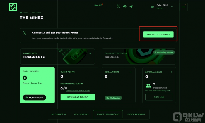 2、點擊proceeo?連接自己的X賬戶并關推,以獲得500個獎勵積分,并可以在X上發推文以解鎖加倍器。