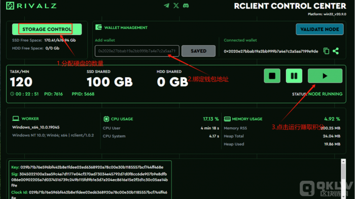 4、打開下載好的客戶端面板,進行操作。第一步,點開STORAGE CONTROL分配硬盤數量(根據自己電腦來配置存儲量和計算資源);第二步,輸入登錄連接的錢包地址;第三步,點擊運行Node。即通過簡單掛機,賺取積分。