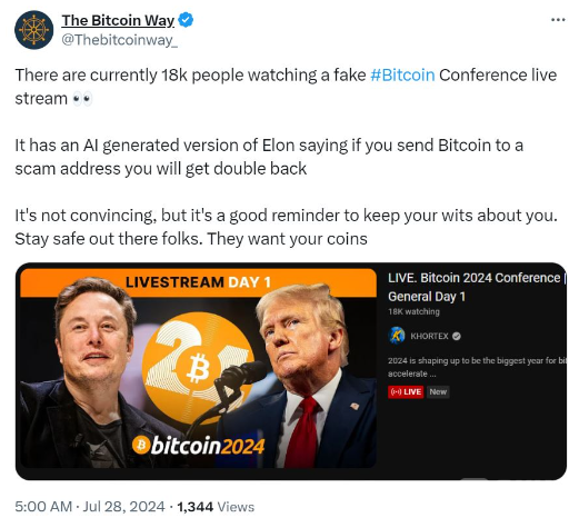 尤其令人擔憂的是,人工智能生成的假聲音和圖像被廣泛用于詐騙。特斯拉首席執行官埃隆·馬斯克的聲音和形象被頻繁使用。6月6日,有超過35個YouTube頻道直播了人工智能生成的假馬斯克聲音,承諾投資者能獲得雙倍回報。Bitcoin咨詢公司The Bitcoin Way在7月27日報告了另一個利用馬斯克聲音的AI騙局。