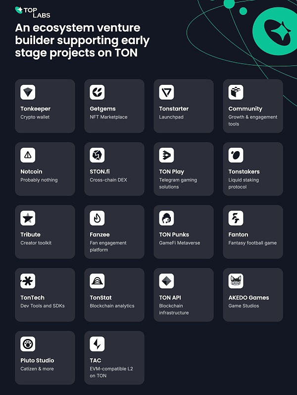 在TON生態中,可以歸類為三種項目,第一是基金會主推,這一類我們可以在官網找到很多。第二是大團隊孵化,例如TOPLabs團隊,大概已經為生態建設了約超過30個高質量項目,又或者是亞洲團隊MicrocosmLabs,也為生態建設了超過10個以上的項目。第三則是新出現的利用業內公開工具或者開源項目發展的中小型項目。