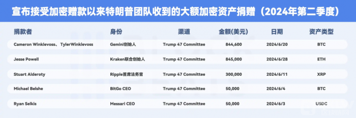 據(jù)OpenSecrets統(tǒng)計,截至6月30日,支持特朗普的十大政治行動委員會已籌集了約2.559億美元,其中很大一部分來自傳統(tǒng)金融領(lǐng)域以及美元捐贈。根據(jù)特朗普競選團(tuán)隊提交的第二季度FEC披露文件,通過crypto向特朗普競選團(tuán)隊捐贈的個人包括Gemini兄弟、Kraken聯(lián)合創(chuàng)始人Jesse Powell、Ripple首席法務(wù)官Stuart Alderoty、BitGo CEO Michael Belshe、Messari CEO Ryan Selkis等,總捐款額近290萬美元。據(jù)breadcrumbs數(shù)據(jù),自2024年5月接受BTC捐贈以來,至少價值180萬美元的Bitcoin已捐贈給特朗普競選團(tuán)隊。