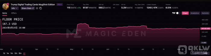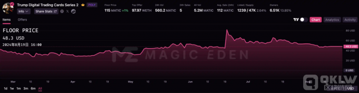 2022年12月,特朗普推出了他的第一個NFT系列“Trump Digital Trading Cards”,該系列售價每張99美元,在不到一天內(nèi)便售罄。2023年,特朗普繼續(xù)推出兩個新系列NFT“Trump Digital Trading Cards Series 2”以及“Mugshot Edition”,并推出了包括特朗普晚宴、簽名紀(jì)念品等NFT權(quán)益。