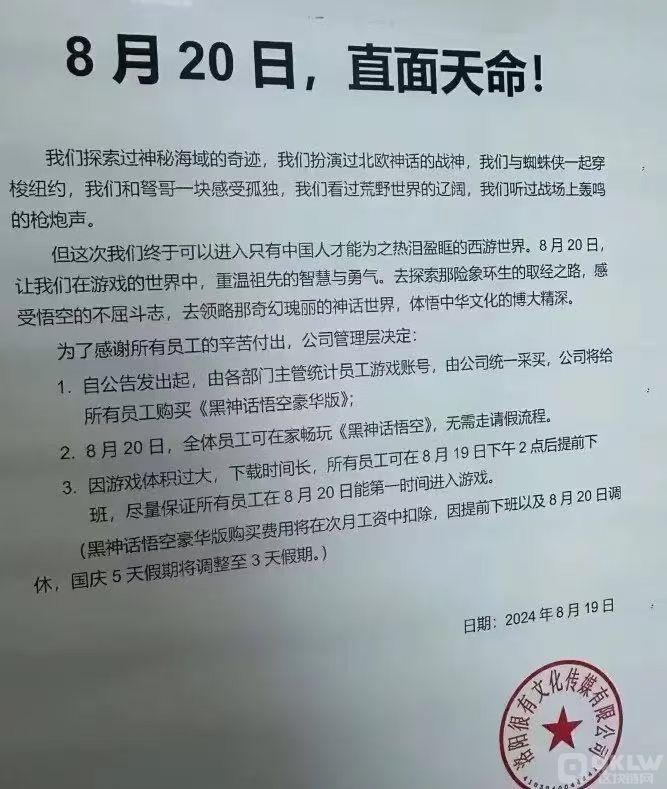 另外,也有公司為了慶祝《黑神話:悟空》上線,在推出當日(20日)放假一天,不過要求員工已經預購《黑神話:悟空》,并且設備硬件(PC、PS5)也要通過性能測試。