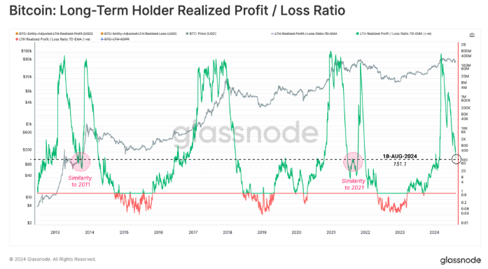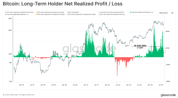 根據(jù)Glassnode的最新報告,Bitcoin的長期持有者在當前橫盤走勢中每天仍保持約1.38億美元的利潤。這表明市場上仍有大量資金流入,以吸收拋售壓力,從而在波動的市場中維持Bitcoin價格的相對穩(wěn)定。