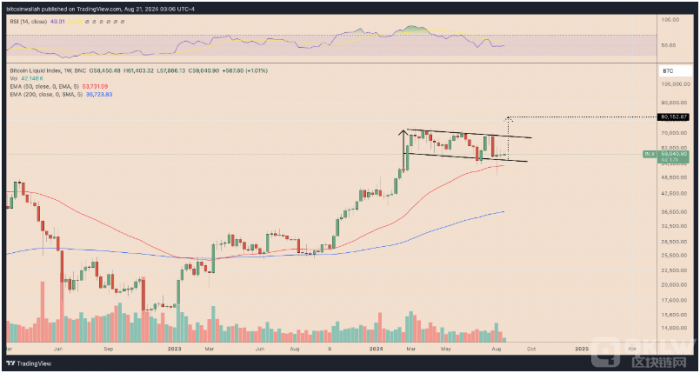 從技術(shù)角度來看,Bitcoin的價格走勢呈現(xiàn)出牛旗形態(tài),自3月份以來一直在下降平行通道中修正。若Bitcoin價格突破這一形態(tài)的上方趨勢線,則有可能進一步上漲,目標價位可能達到80,000美元。