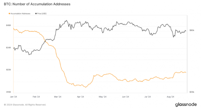 從5月份開始,這些累積地址的數(shù)量開始小幅回升,到了8月份,數(shù)量穩(wěn)定在82.2萬個左右。這一小幅回升反映出長期持有者在減半后對市場波動的謹慎態(tài)度,盡管市場仍存在不確定性。