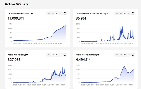 據TonStat統計,TON鏈上的活躍錢包數量從年初的108萬增長到現在的1310萬。