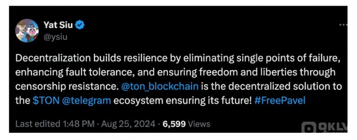 Animoca Brands 共同創(chuàng)辦人 Yat Siu 也在社交平臺 X 上表達(dá)了對 TON 網(wǎng)絡(luò)和 TG 的支持。他強(qiáng)調(diào)Decentralization是抵抗審查、維護(hù)自由的關(guān)鍵,并在推文中標(biāo)注了「#FreePavel」以示支持。