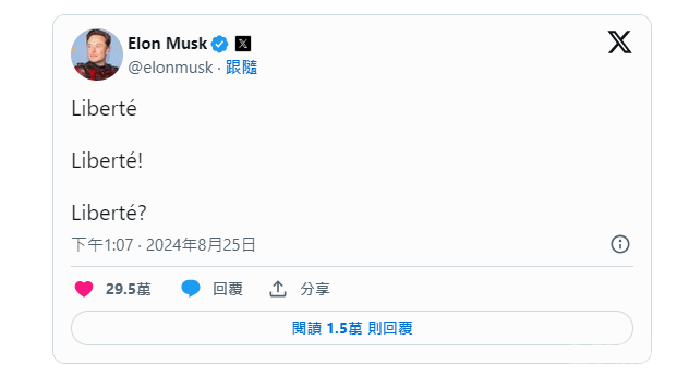 特斯拉創(chuàng)辦人 埃隆.馬斯克(Elon Musk) 也在 X 平臺上通過法語發(fā)聲,呼吁「自由」并強(qiáng)調(diào)言論自由的重要性。