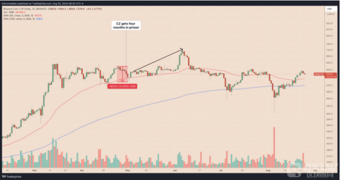盡管目前面臨挑戰,但一些技術指標顯示,TON有可能在未來幾周內反彈。其價格走勢與幣安前首席執行官趙長鵬被判刑前后的情況相似。趙長鵬被捕后,BNB價格經歷了短期的下跌,但隨后強勁反彈,最終上漲近35%。