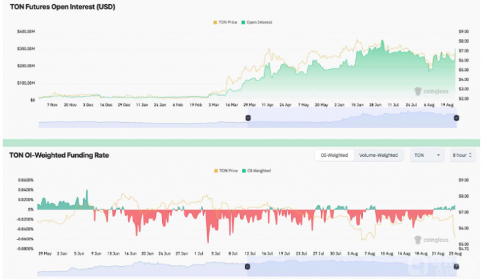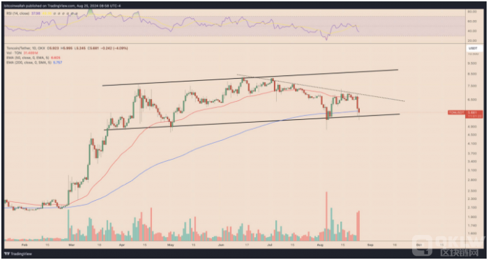 從技術角度來看,TON仍在一個明確定義的上升通道內交易。8月25日,TON的相對強弱指數(RSI)為37.54,接近超賣區域,這通常預示著價格可能會出現反彈。上升通道的上方趨勢線約為8.50美元,若價格能回升至這一水平,將表明約50%的上漲潛力。