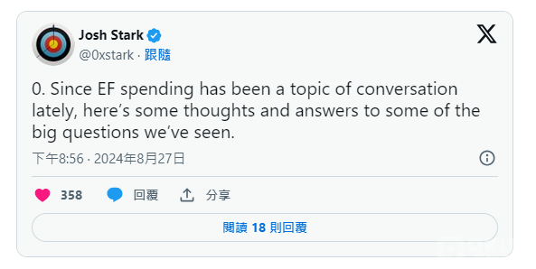 對(duì)此,Josh Stark 昨日在社交平臺(tái) X 上發(fā)文,回應(yīng)了社區(qū)對(duì)Ethereum基金會(huì)支出的關(guān)注: