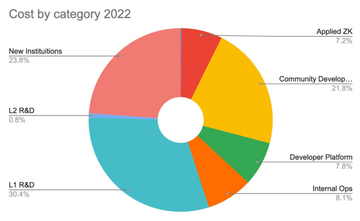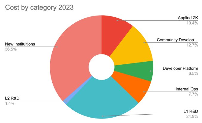 Stark 還透露了這份報(bào)告中的支出概況,包括內(nèi)部和外部支出。具體而言,L1 研發(fā)的支出包括對(duì)外部項(xiàng)目團(tuán)隊(duì)的資助以及 EF 內(nèi)部的支出。其中,內(nèi)部支出占 38%,外部支出占 62%。